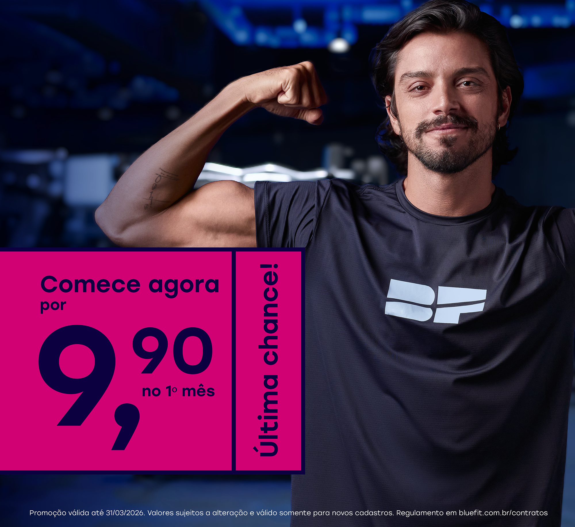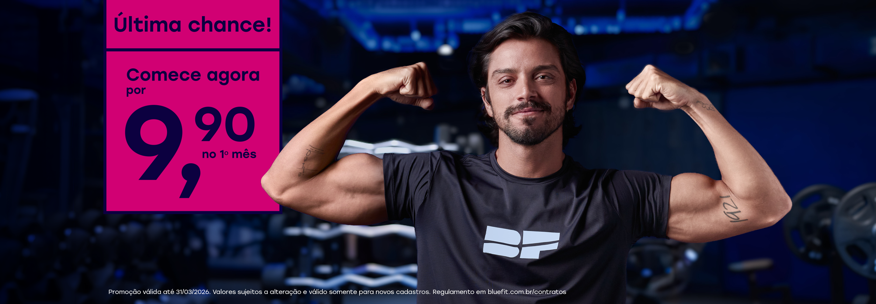 O preço da mensalidade não inclui taxas de matrícula e manutenção. Pagamento mensal por cartão de crédito. O preço mínimo pode variar entre os planos e as unidades. Consulte a relação de unidades em www.bluefit.com.br. Sujeito a alterações sem aviso prévio. Não aceitamos cheques. As Taxas de Manutenção e matrícula aparecerão no seu cartão de crédito somadas e com o nome "Taxa de Adesão".